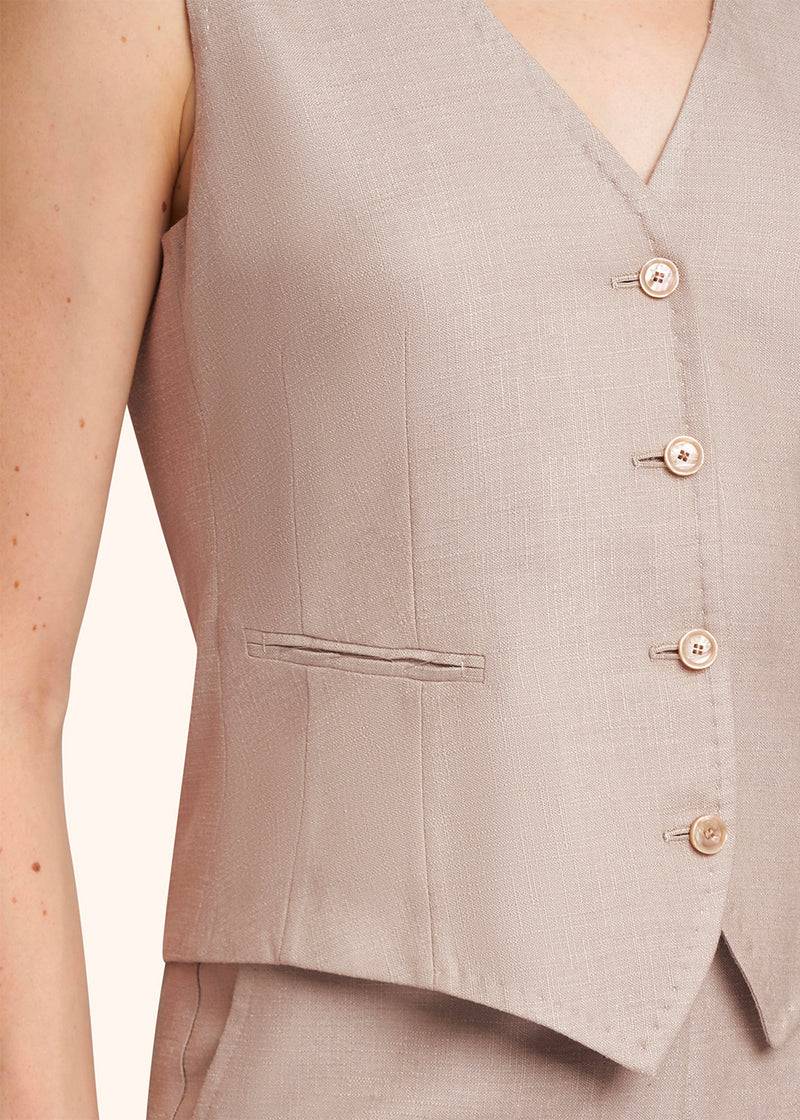 Gilet monopetto realizzato in un prezioso mix di seta e lana di colore beige, perfetto per essere indossato nell'iconico tailleur tre pezzi. Il capo, interamente tagliato e cucito a Napoli dai nostri artigiani, è foderato in satin di pura seta bianca ed è caratterizzato dall'assenza di revers, dalla presenza di quattro bottoni in madreperla e tasche a doppio filetto. Perfetto per le occasioni formali grazie ad un twist elegante e sofisticato, il gilet può essere indossato sotto un blazer in tonalità o semplicemente su un mini dress. Questo capo Kiton parla a una donna di classe, dalla personalità forte e appassionata, fine intenditrice della tradizione sartoriale. Al fine di preservare la bellezza della tua giacca Kiton, consigliamo lavaggio e stiratura professionali.