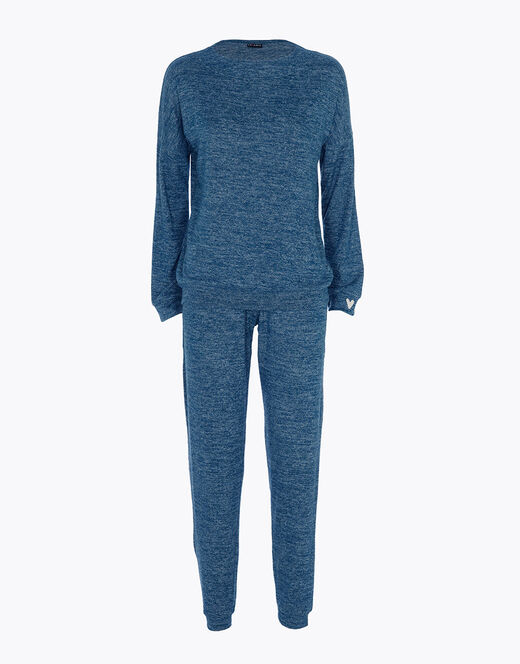 Scopri il nostro pigiama lungo in tessuto caldo e garzato esternamente, color blu petrolio, perfetto per assicurare calore e comfort al tuo abbigliamento da notte. Caratterizzato da un girocollo e polsini sulle maniche con ricamato un cuore. I pantaloni presentano comode tasche e polsini per una vestibilità perfetta.