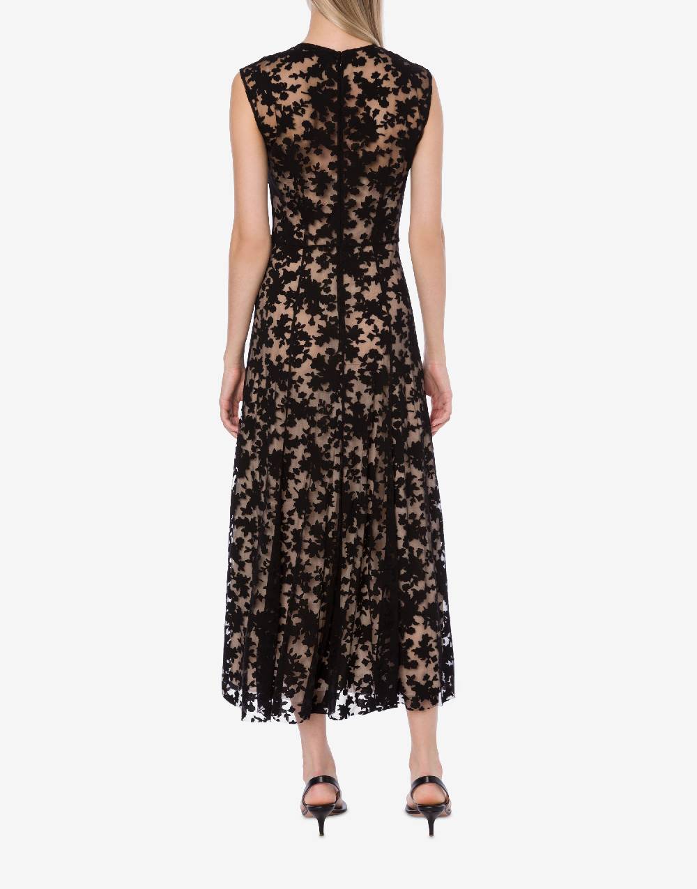Abito longuette in jersey devoré effetto pizzo, dal fascino romantico e sensuale. La silhouette aderente si apre più morbida e fluida sulla gonna.