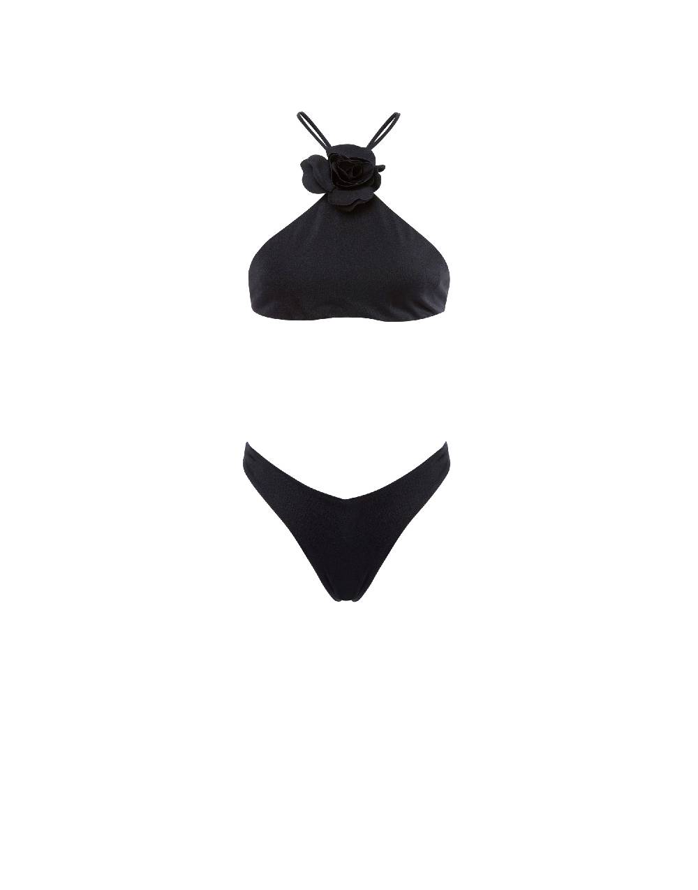 Bikini in lycra con spilla bijoux a forma di fiore per un touch romantico. Abbinalo alla minigonna coordinata per un look beachwear iper femminile.