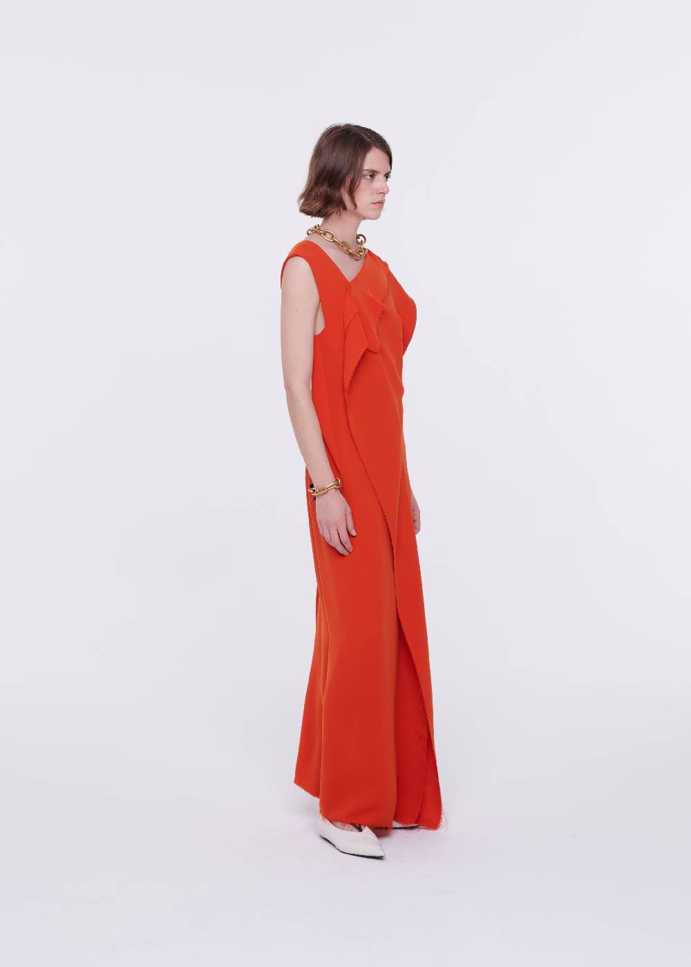Abito lungo color corallo con pannello frontale e una spallina cascante. Scollo a V anteriore e posteriore, orlo a taglio vivo e chiusura con cerniera posteriore a scomparsa.Fedele alla taglia indicata