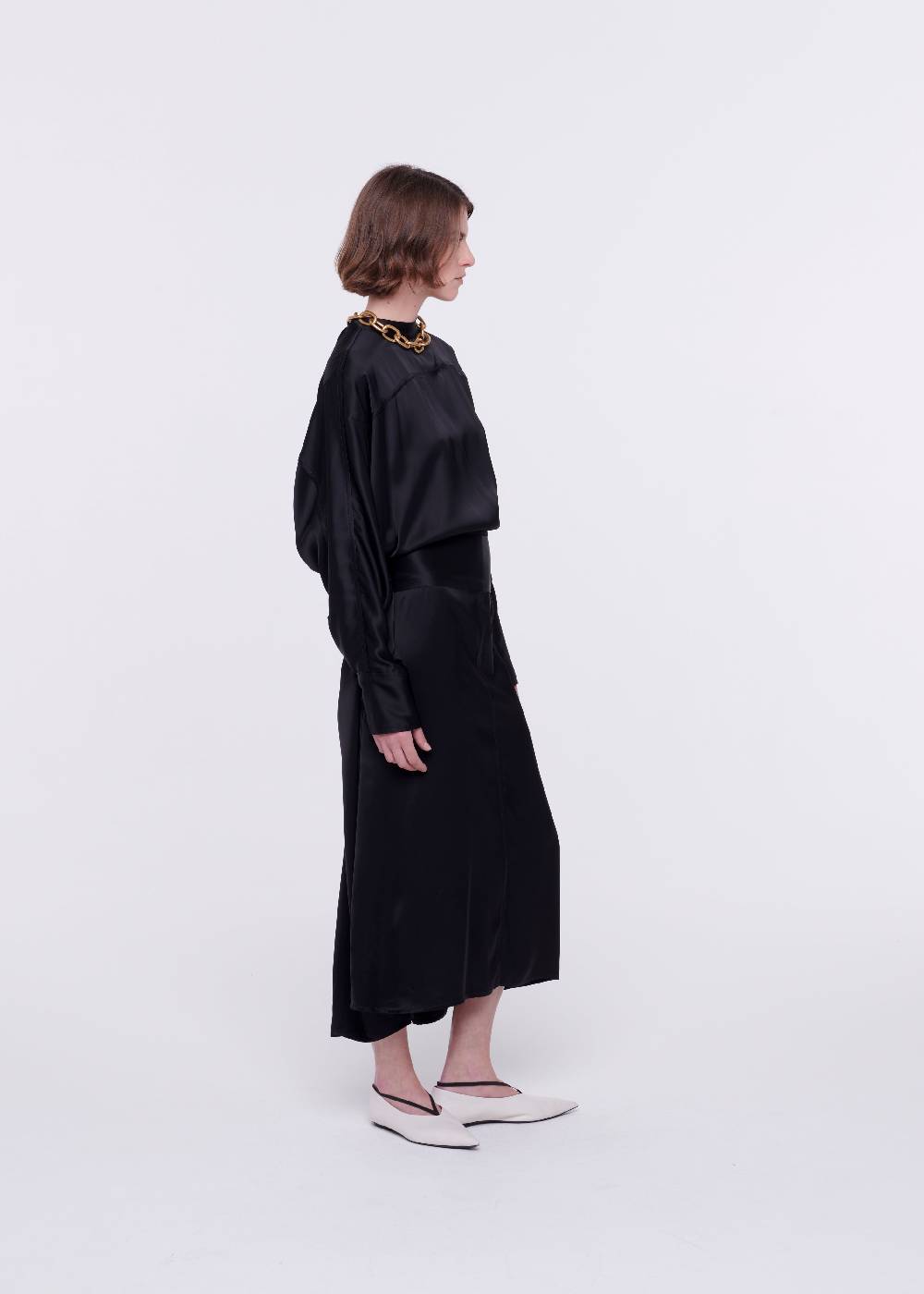 Abito nero in raso con ampia fascia in vita e maniche lunghe. Scollo rotondo, polsini allungati con bottoni e chiusura posteriore con bottoni. Fedele alla taglia indicata