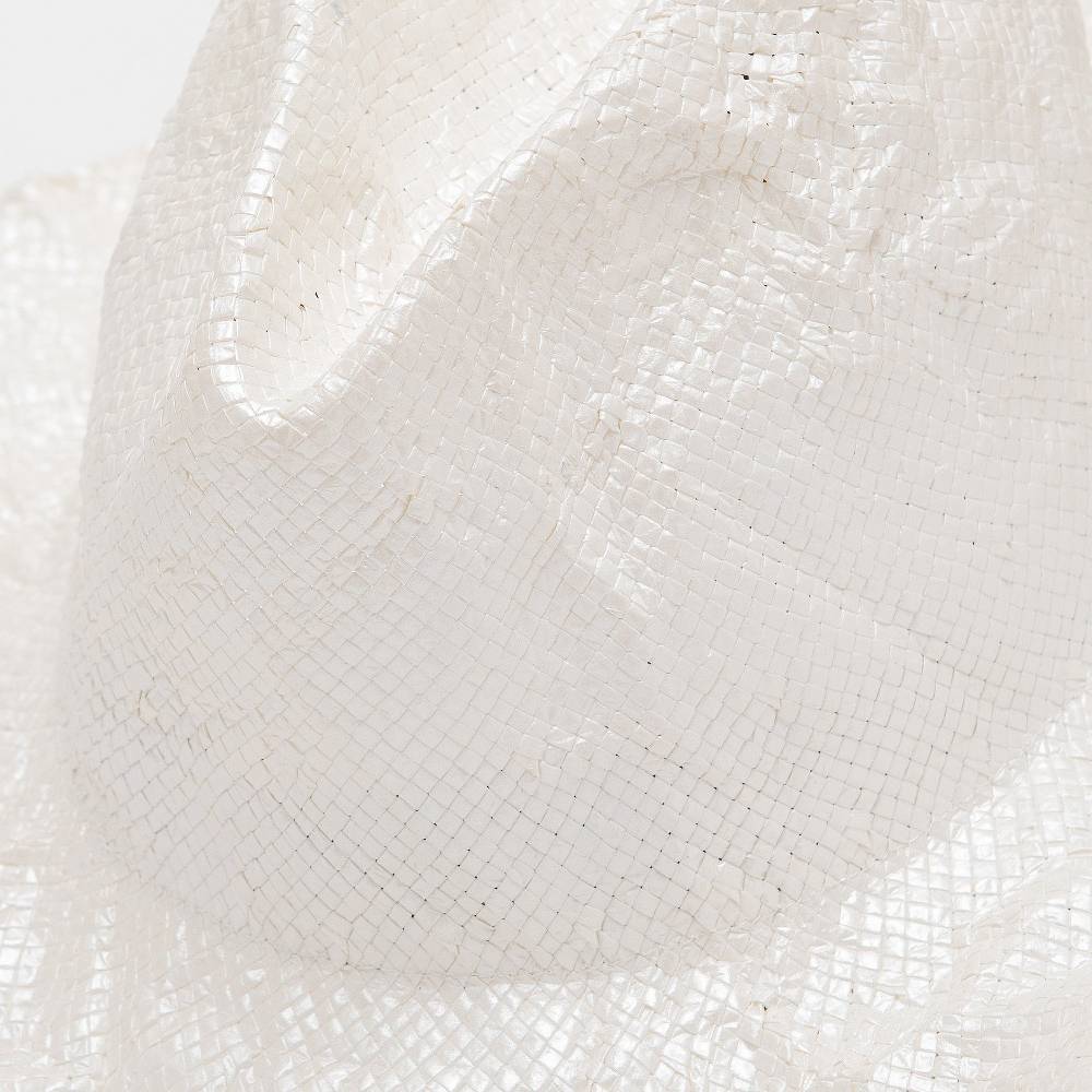 Composizione: 100% Cellulosa GrezzaColore:bianco perlaCappello a tesa classica in cellulosa con onde irregolari intrecciate che ricordano la pelle di un rettile.Disegnatoe realizzato a mano a Firenze, Italia: la cellulosa è un materiale organico ed ecologico che consente di creare cappelli intrecciati a mano con strisce di materiale cucite insieme