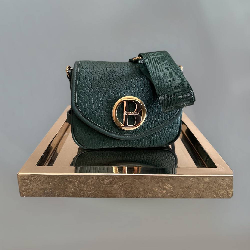 Borsa bottalata con tracolla ed ornamento "B" contrasto finitura lucido/opaco