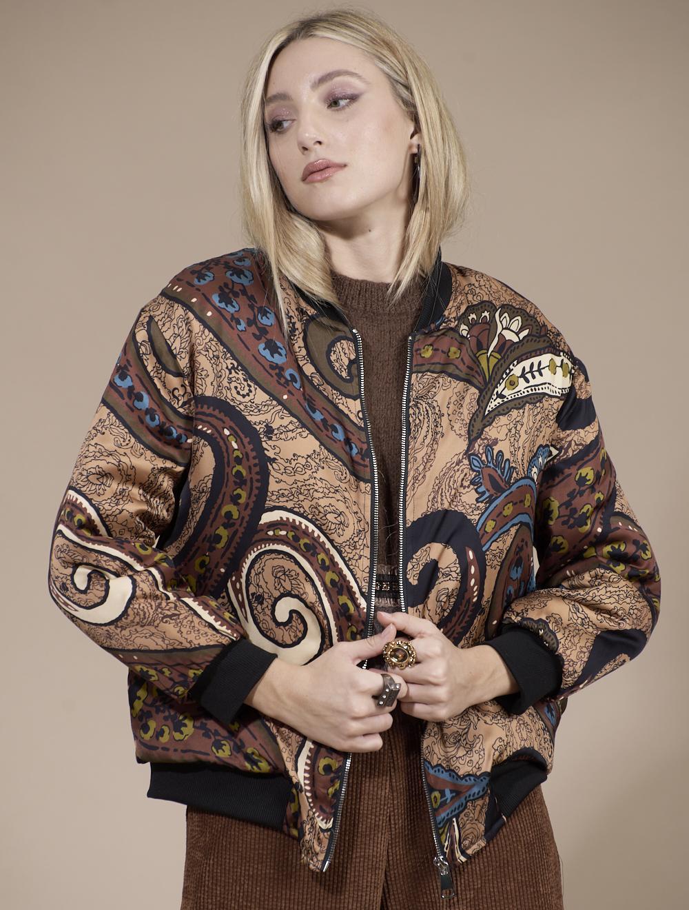 Un cappotto di colore marrone terra di Siena, in velluto cinquecento righe, con collo con ampio revers, doppiopetto, tasche laterali. Foderato con raso arancione.