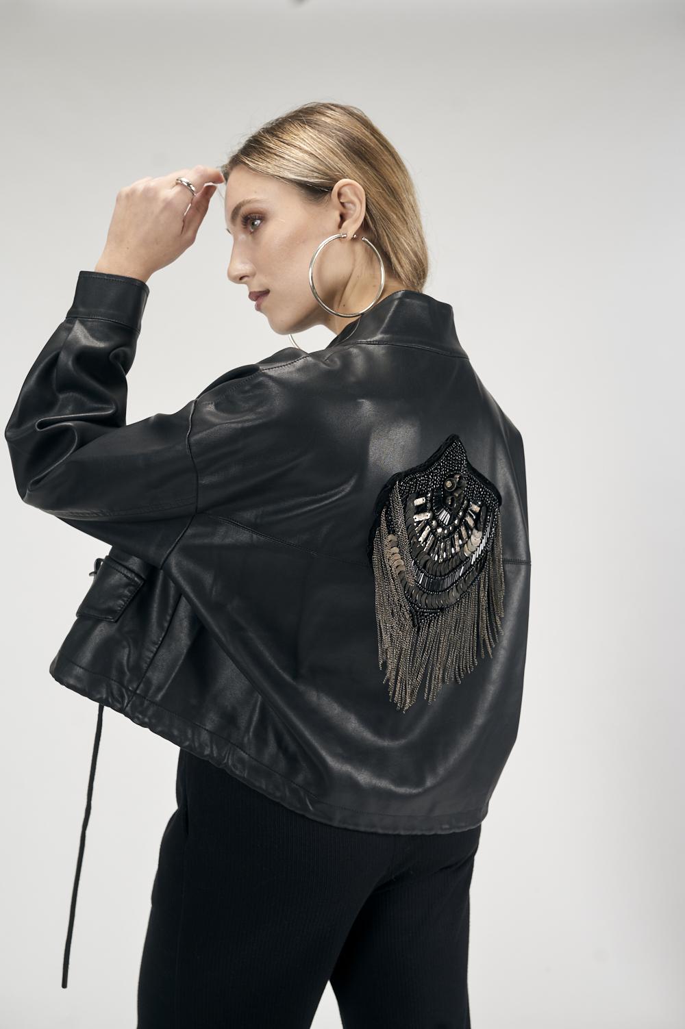 Un giubbotto corto in ecopelle nera con maniche a pipistrello. Si chiude con quattro bottoni ed ha due tasche. Ha una coulisse per evidenziare il punto vita. Sul dietro bellissima applicazione ricamata.