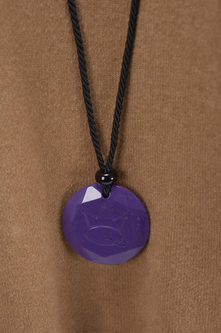 Una maglia in viscosa color biscotto, collo alto. Collana con ciondolo in pvc personalizzato con corona.