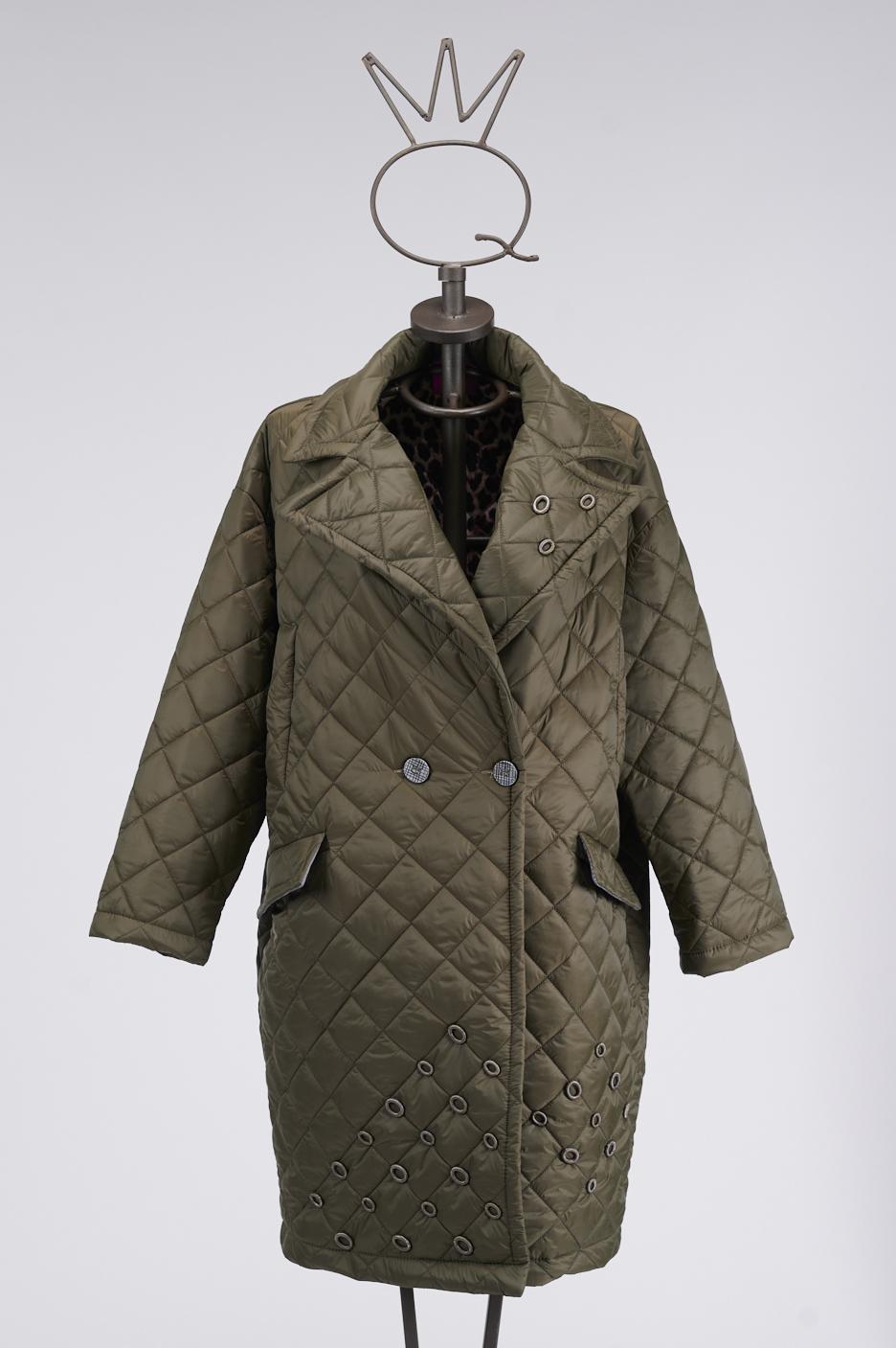 Un piumino verde militare impunturato, pesantezza 100 grammi. Scollo a V con chiusura a doppio petto con bottoni in metallo. Sul fondo applicazione di anellini in metallo. Due tasche. Internamente è foderato con una fodera maculata.