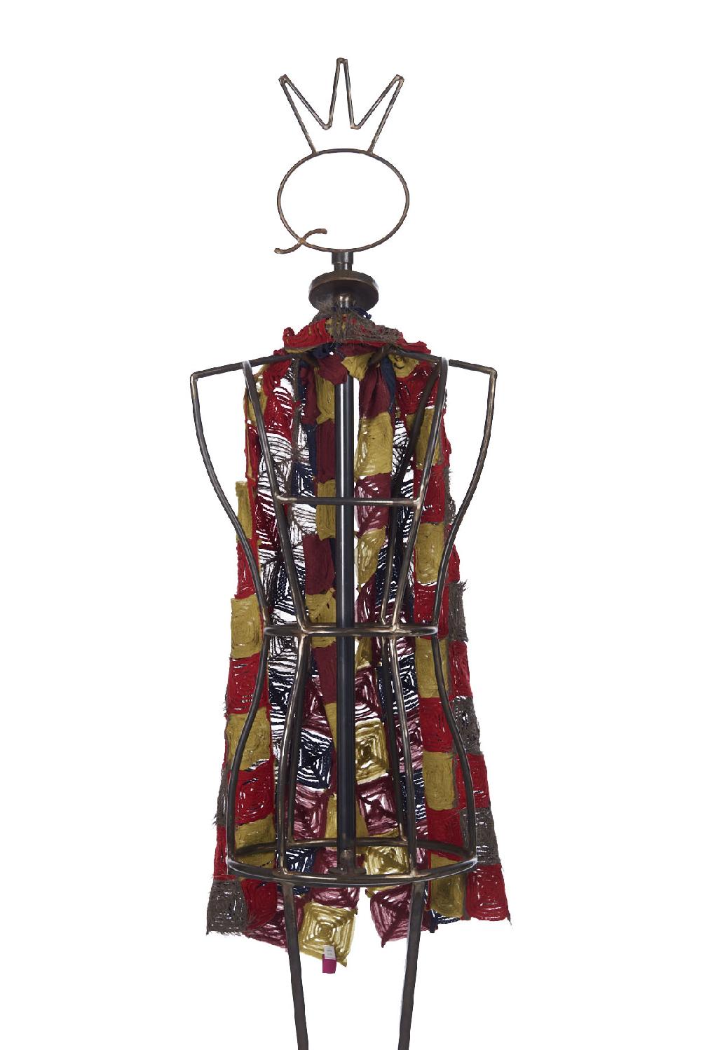Una sciarpa in cotone con lavorazione a ricamo che formano dei quadrati nei colori marrone, blu, bordeaux, giallo.