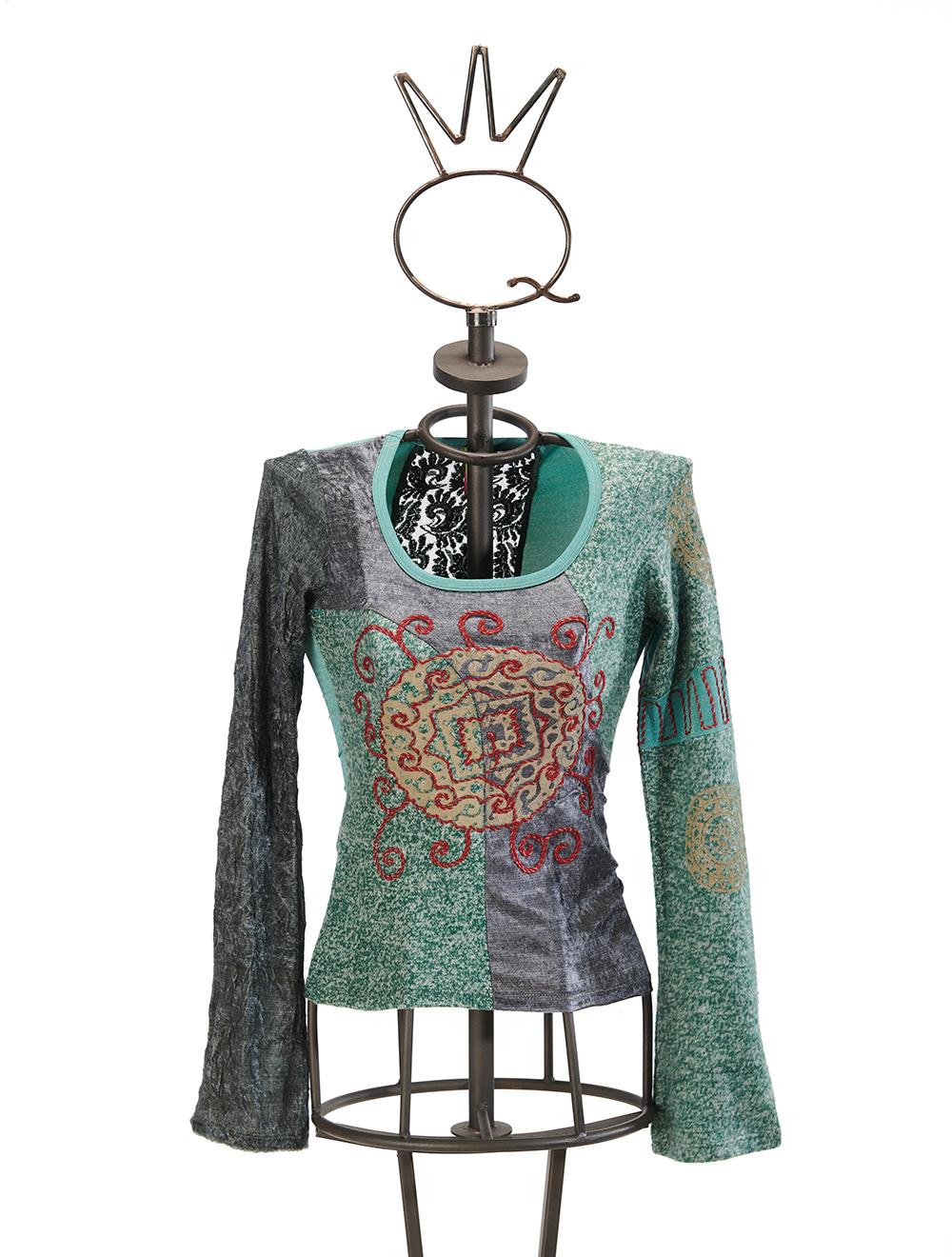 Una t-shirt corta in jersey elasticizzato nei toni del verde e grigio. Ricamo con filo rosso sul davanti, scollo rotondo. Bellissimo pizzo verde bottiglia sul dietro.