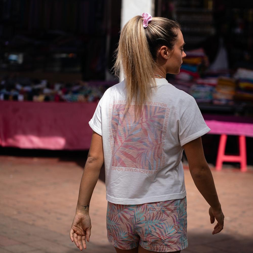 descrizione / Crop T-Shirt Bianca in 100% cotone organico. Crop t-shirt girocollo, mezza manica in jersey fiammato. Stampa piazzata su fronte e retro capo. Etichetta flag label Seay sul fianco. Certificato GOTS. Made in Italy