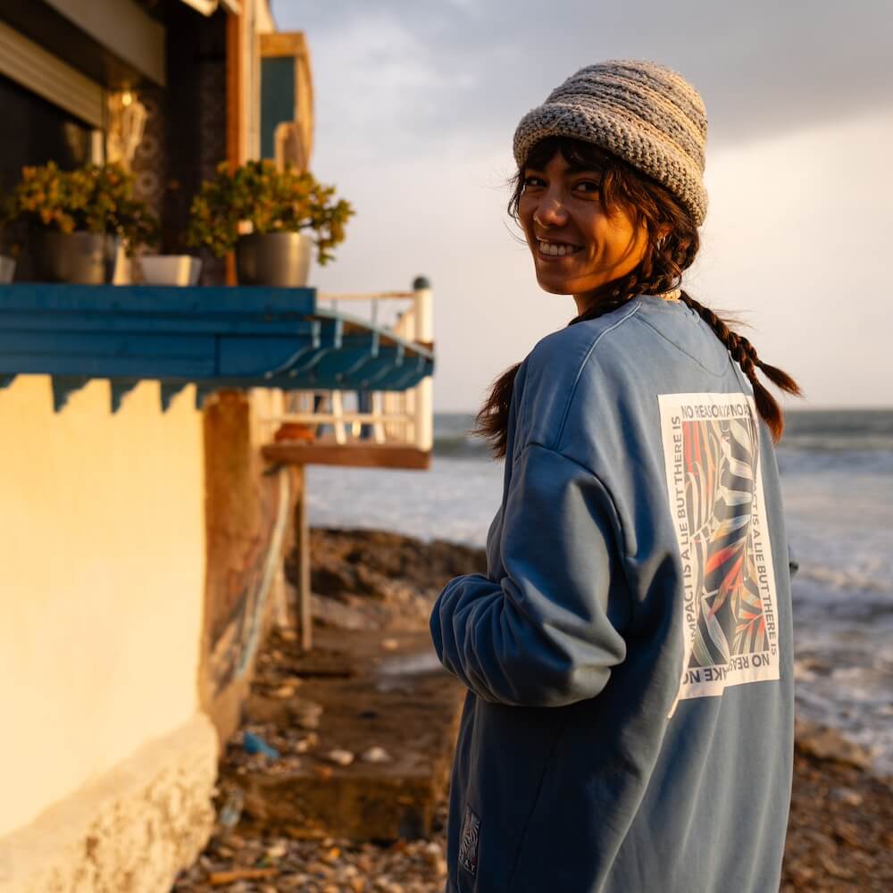 descrizione / Felpa Girocollo Blu Bamboo in 100% cotone organico. Unisex. Girocollo, manica lunga, inserti in felpa sulle spalle. Vestibilità comoda, veste una taglia in più. Patch stampato applicato sulla schiena. Etichetta patch Seay applicata sul davanti. Trattamento tinto capo, stone wash con enzimi. Certificata GOTS. Made in Italy
