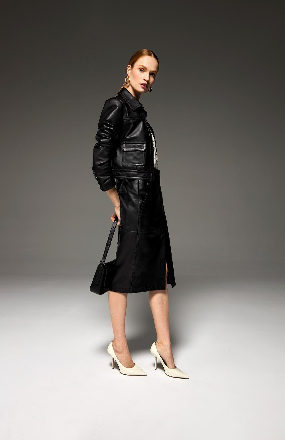 Descrizione Gonna tubino realizzata in nappa morbida. Tagli tipici della pelle e tasche oblique sui fianchi. Spacco frontale e zip a vista sul retro. Dettagli Composizione: 100%Pelle product series name: SEVENTY VENEZIA Collezioni: Donna