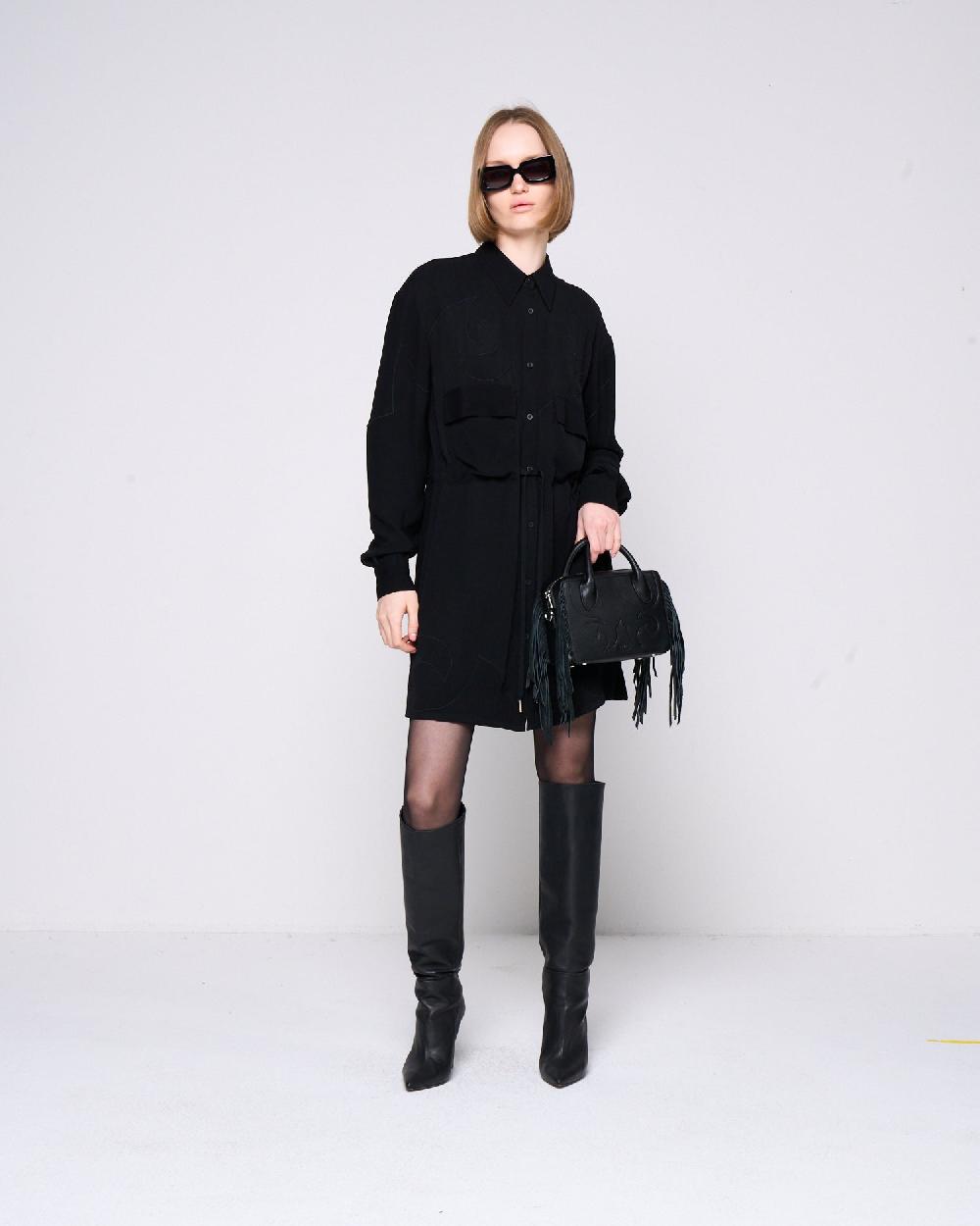 Abito chemisier con ricami. Collo a punta e maniche lunghe. Chiusura frontale con bottoni e vita arricciata.