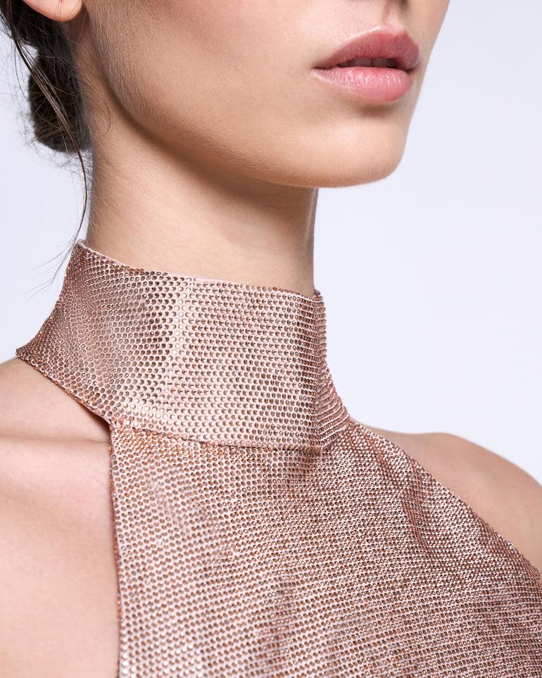 Abito lungo con brillantini. Collo halter e spalle scoperte.