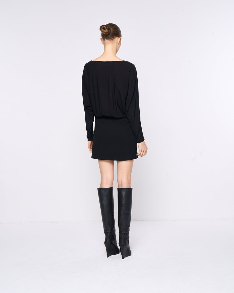 Abito mini con gonna aderente. Scollo a barca e maniche lunghe.