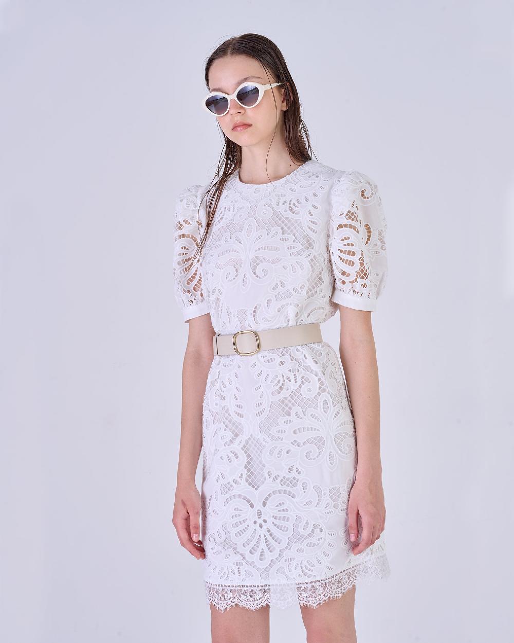 Abito corto con ricami. Scollo rotondo e maniche corte a palloncino. Smerlo sul fondo.
