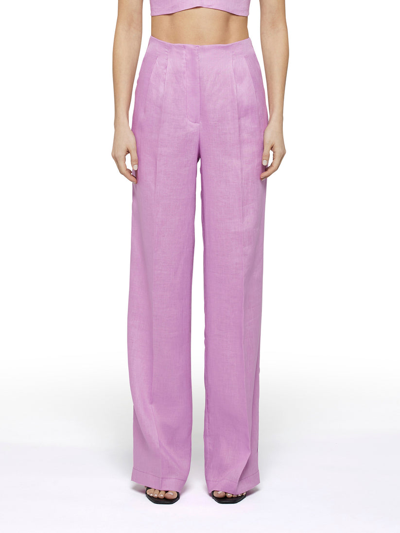 Pantalone dritto a vita alta con pinces in tecno lino.