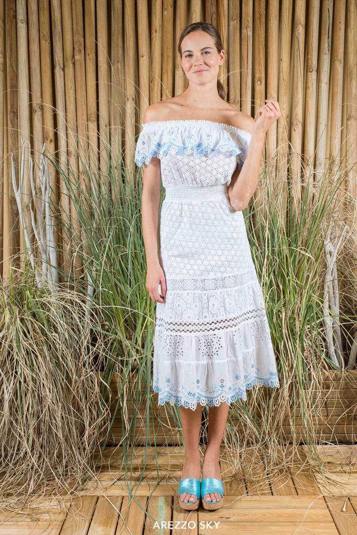 Midi dress perfetto abito da coktail o da poter indossare quotidianamente , particole il suo ricamo a contrasto nelle varianti tono su tono o a contrasto azzurro o rosa su fondo bianco .