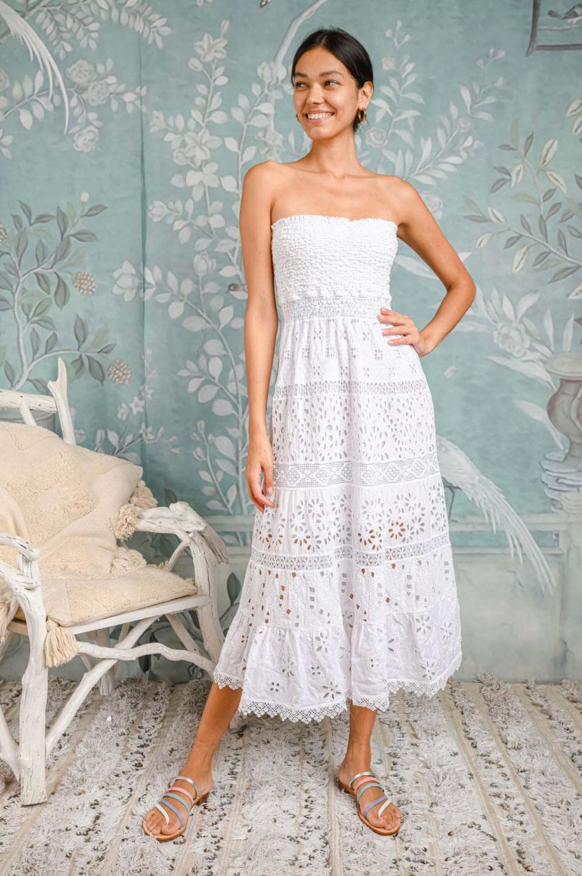 Abito Unakite lungo in cotone ricamato versatile e facile da indossare. Abito con elastico sulle spalle.