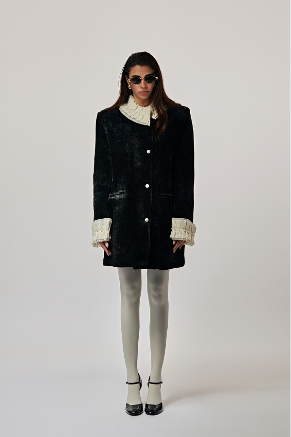 Camicia in pizzo con collo con rouches e bottoni gioiello