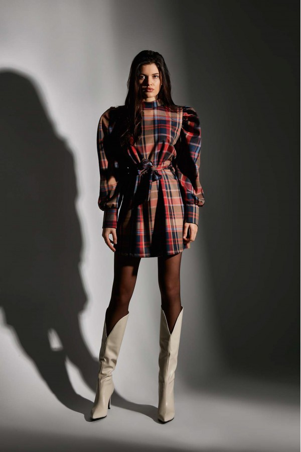 Abito mini tessuto stampa a quadri con collo tondo, maniche a palloncino e cintura in tessuto in vita.