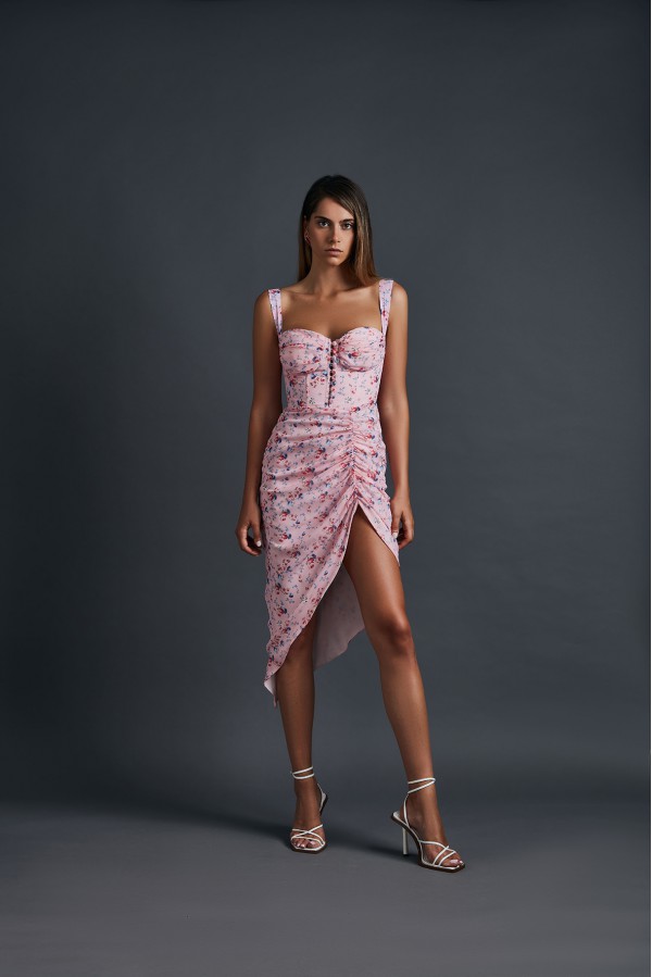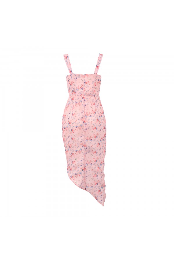 Abito midi gonna plissettata asimmetrica con spacco, bretelle e bottoni coperti applicati sul fronte.