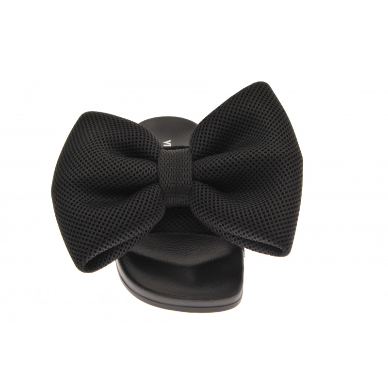 Codici tipici delle calzature sportive si fondono a dettagli glamour nel sandalo slider impreziosito da un grande fiocco.