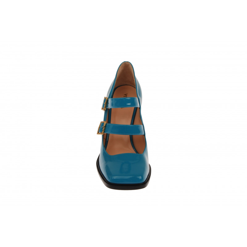 Décolleté con dettagli vintage come la punta squadrata e il tacco largo, realizzato in vernice. Le fibbie decorate con strass color oro aggiungono una nota esclusiva.